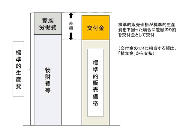 月毎に標準的販売価格(粗収益)と標準的生産費(生産コスト)を算出し、標準的販売価格が標準的生産費を下回った場合に、その差額の9割を交付金として交付します。