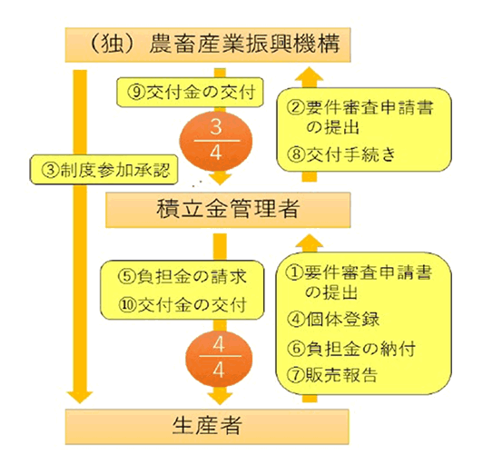 交付金の交付を受けようとする肉用牛の生産者は、業務対象年間の初年度(注)に、(独)農畜産業振興機構へ申請書を提出し、審査完了後、「登録生産者」として登録されます。