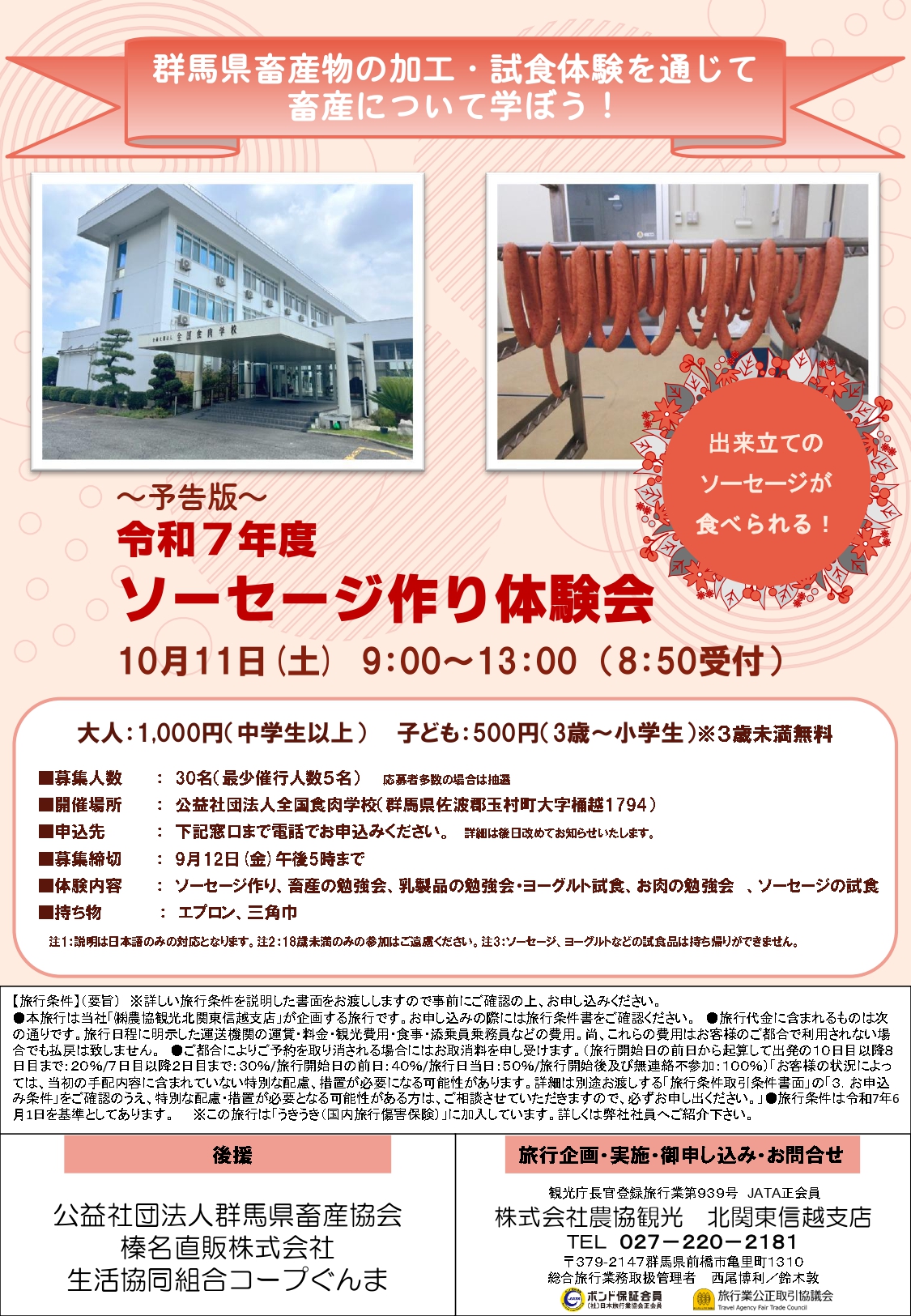 トップ消費者交流群馬県畜産物の加工・試食体験会 群馬県畜産物の加工・試食体験会 お知らせNEWS2025.11.14群馬県畜産物の加工・試食体験会「群馬県畜産物の加工・試食体験会」ページを更新しました2025.07.30群馬県畜産物の加工・試食体験会ソーセージ作り体験会の参加者募集ニュース一覧へ催しもののご案内※令和7年度ソーセージ作り体験会は終了しました令和7年度群馬県畜産物の加工・試食体験会(ソーセージ作り体験) を開催します申し込みは、株式会社農協観光 北関東信越支店 TEL:027-220-2181 まで催しものの開催状況2025年10月11日開催令和7年度ソーセージ作り体験会お問い合わせ各事業に関するお問い合わせは、以下のメールフォームよりお問い合わせください。お問い合わせメールフォーム