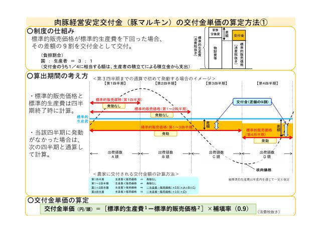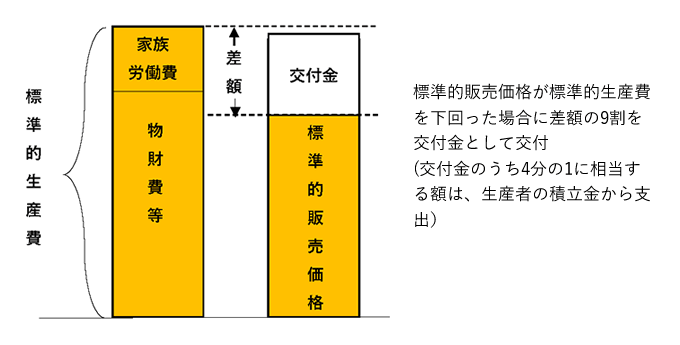 畜産経営の安定に関する法律に基づき、標準的販売価格が標準的生産費を下回った場合に、差額の9割を交付金として交付します。(交付金のうち4分の1に相当する額は、生産者の積立金から支出)