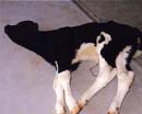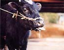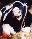 ▲後弓反張、眼球振盪及び前肢の伸張などの神経症状を示す子牛