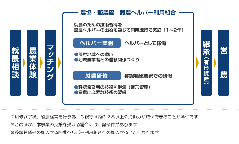 就農のための技術を習得するための研修は、酪農ヘルパーに勤務し、業務と並行しながら移譲希望農家等で行います。酪農ヘルパーの出役を通じて、地域の農業者と関係を作りながら、営農技術を習得していく仕組みです。