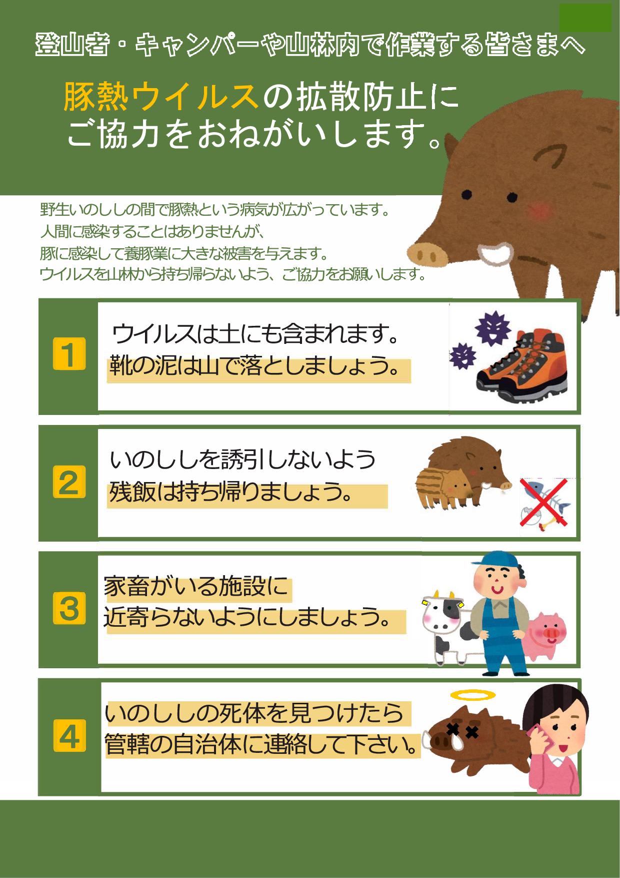 トップお知らせ豚熱ウィルスの拡散防止にご協力くださいお知らせ豚熱ウィルスの拡散防止にご協力ください2025.04.16 更新「野生いのしし」の間で「豚熱」という病気が流行っています登山やキャンプをされる方、山林で作業をされる方は、山林からウイルスを持ち帰らないように、ご理解とご協力をお願いいたします豚熱対策について (群馬県農政部農政課) 前の記事次の記事 一覧に戻る