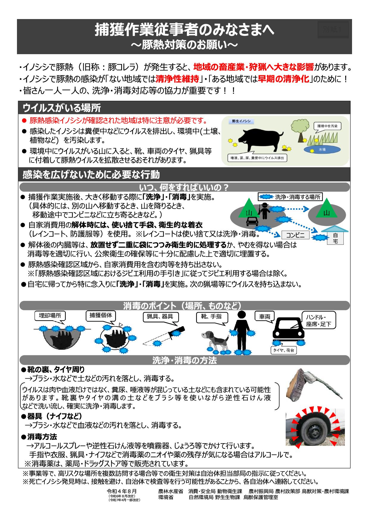 トップお知らせ捕獲作業従事者の皆様へ豚熱対策のお願いお知らせ捕獲作業従事者の皆様へ豚熱対策のお願い2025.04.16 更新捕獲作業に従事される方は、豚熱対策へのご配慮をお願いたします 前の記事次の記事 一覧に戻る