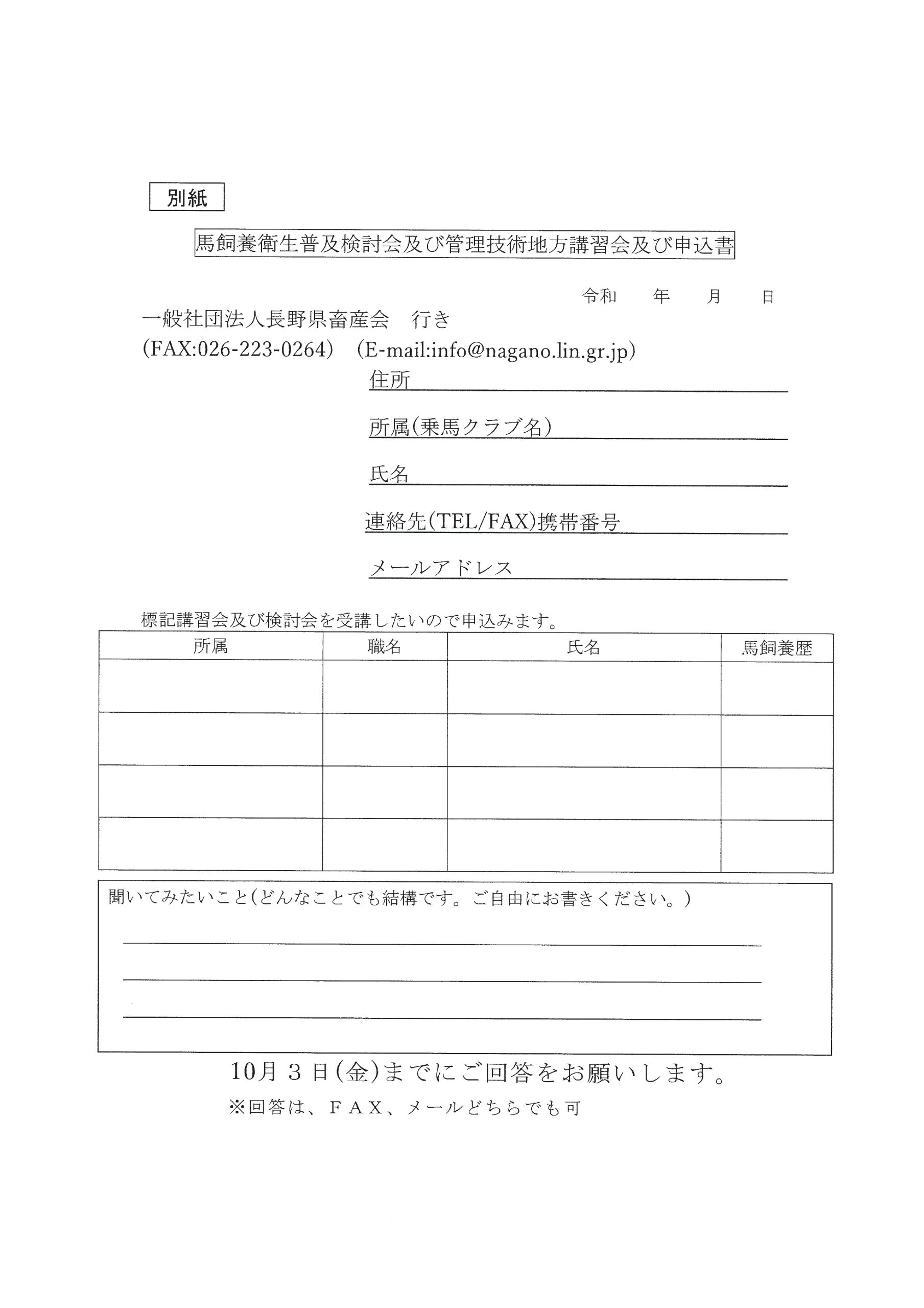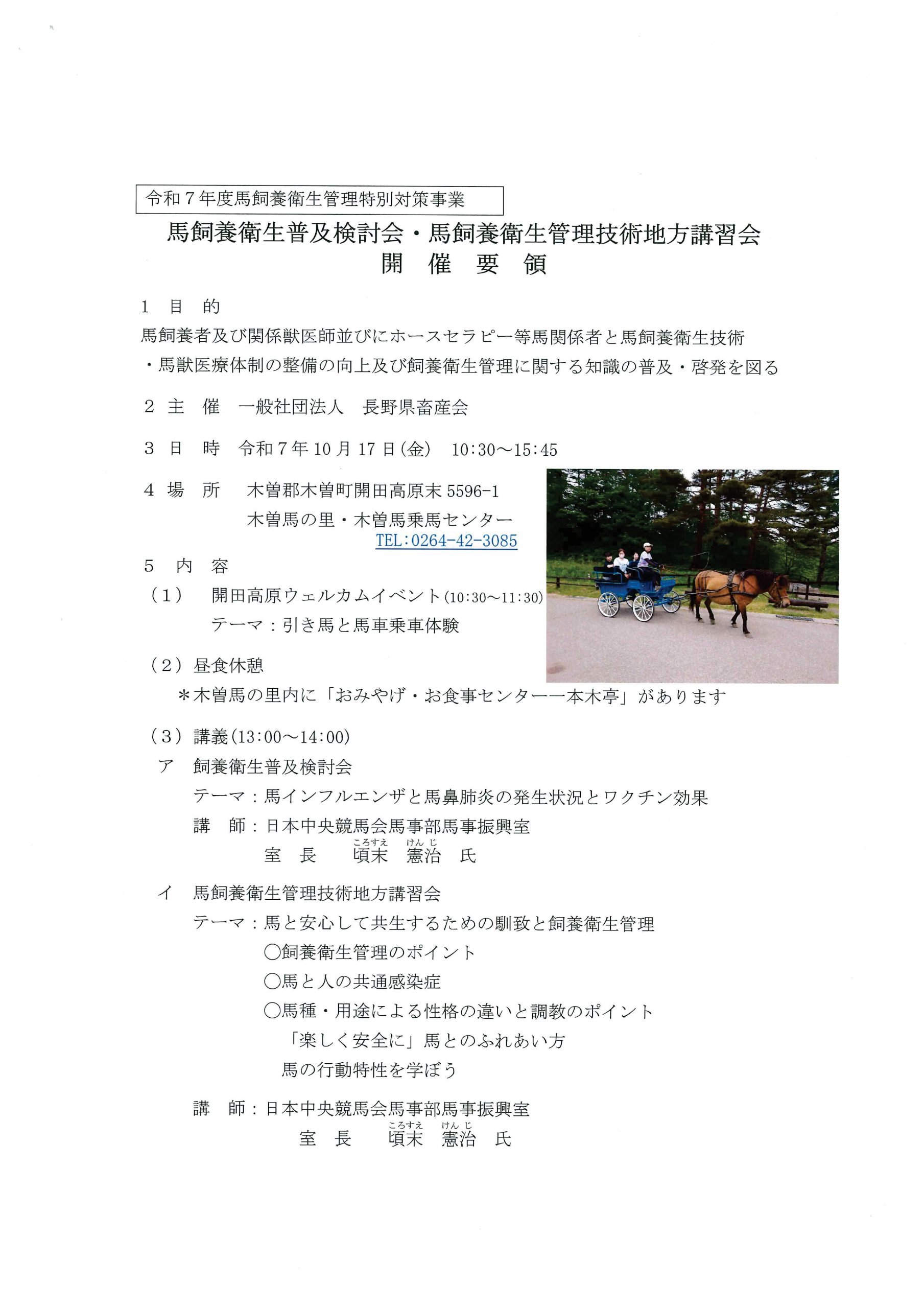 トップお知らせ(一社)長野県畜産会主催 馬飼養衛生普及検討会・馬飼養衛生管理技術地方講習会のお知らせお知らせ(一社)長野県畜産会主催 馬飼養衛生普及検討会・馬飼養衛生管理技術地方講習会のお知らせ2025.09.04 更新(一社)長野県畜産会では、令和7年度馬飼養衛生管理特別対策事業において、馬飼養衛生普及検討会及び馬飼養衛生管理技術地方講習会を開催いたします。参加をご希望方は、直接(一社)長野県畜産会(TEL:026-228-8809、FAX:026-223-0264)へお申し込みください。詳細につきましては下記PDFファイルをご覧ください 前の記事次の記事 一覧に戻る