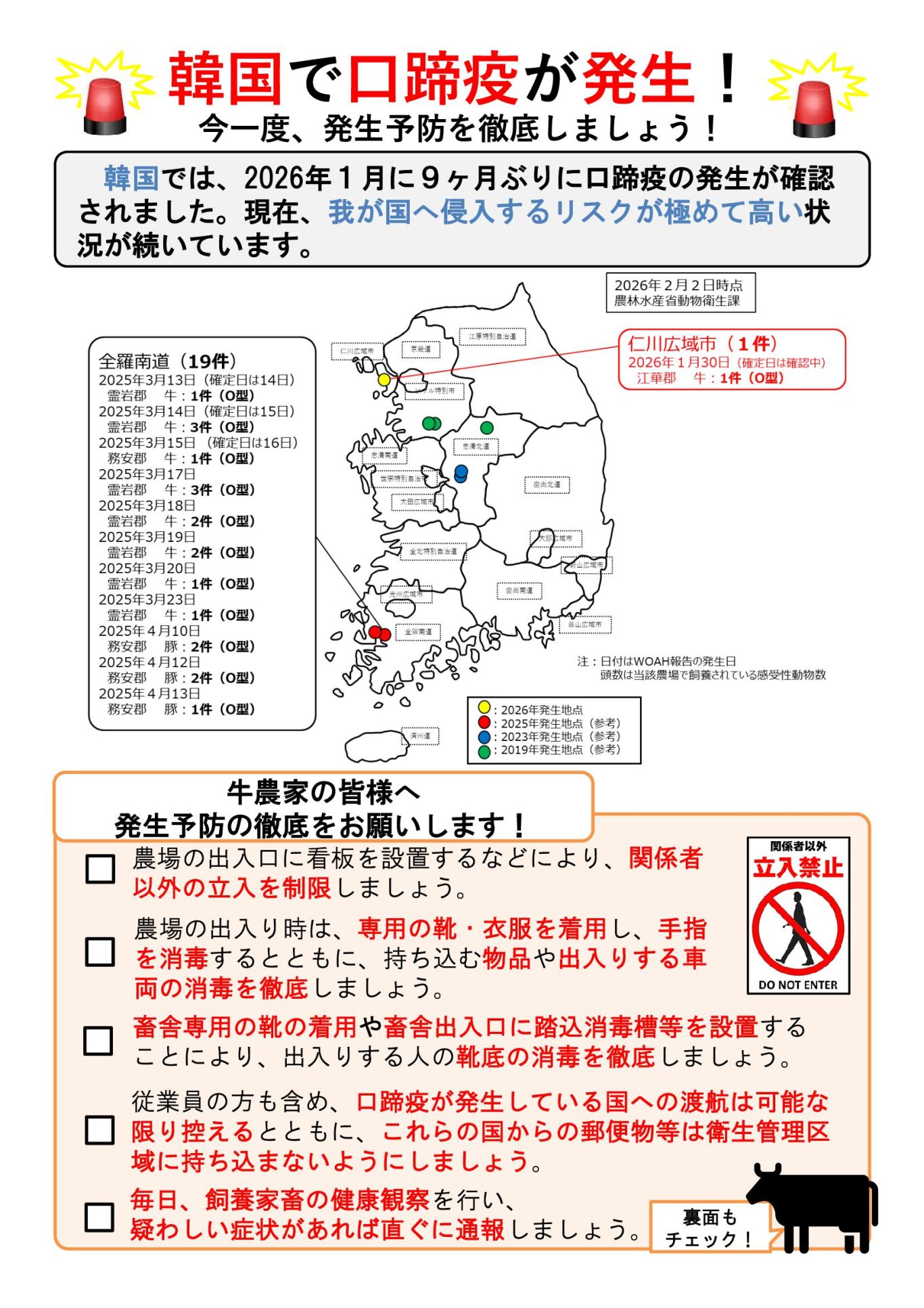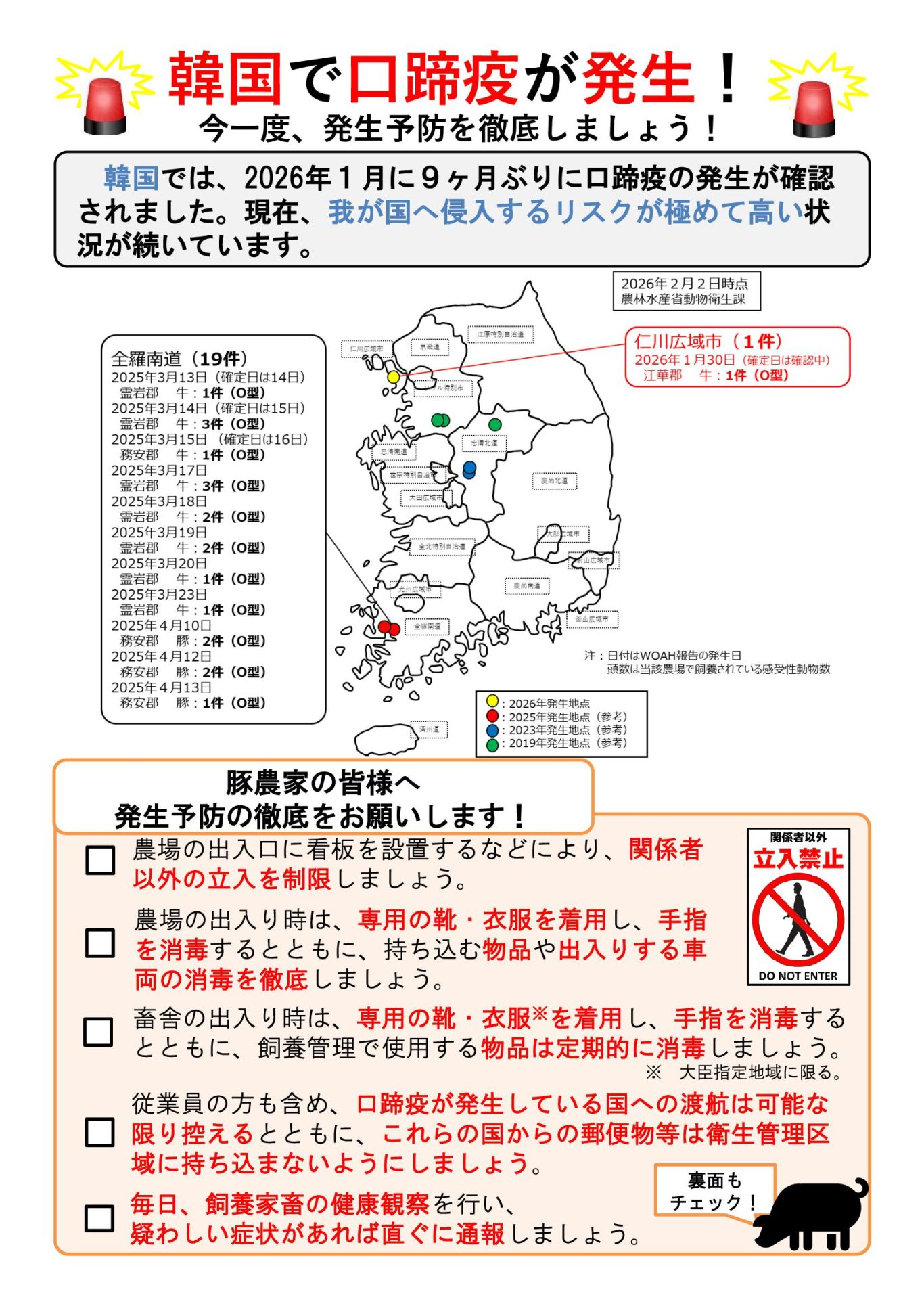 口蹄疫については、令和8年1月31日、韓国仁川広域市江華郡の牛飼養農場(246 頭)で、 2025 年4 月(О 型)以来、9ヵ月ぶりに発生しており、また、アフリカ豚熱についても、同国においては 2019 年9月以降、継続的な発生があり、本年1月 26 日、これまで本病の発生が確認されていなかった全羅南道の豚飼養農場においても発生が確認されています