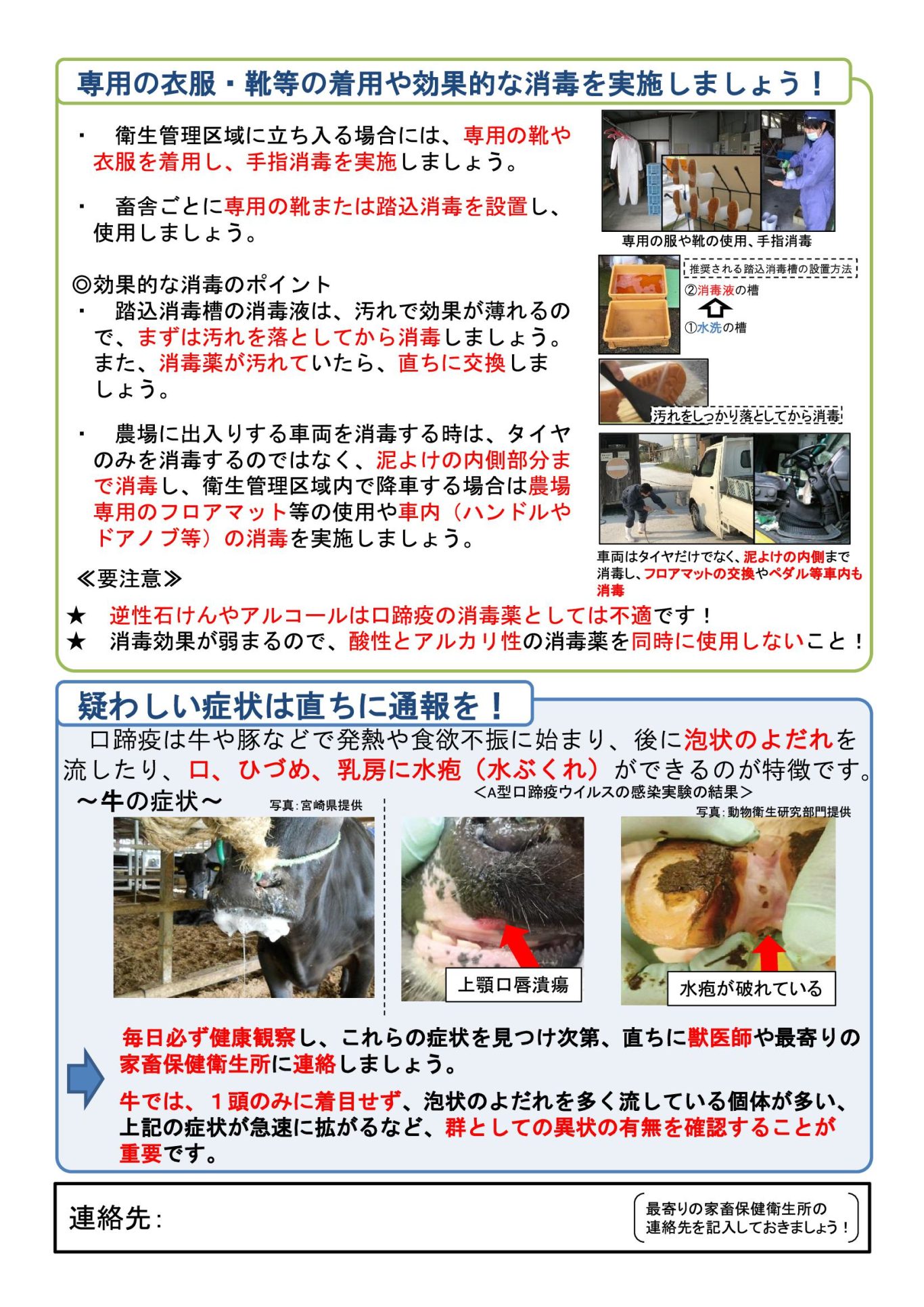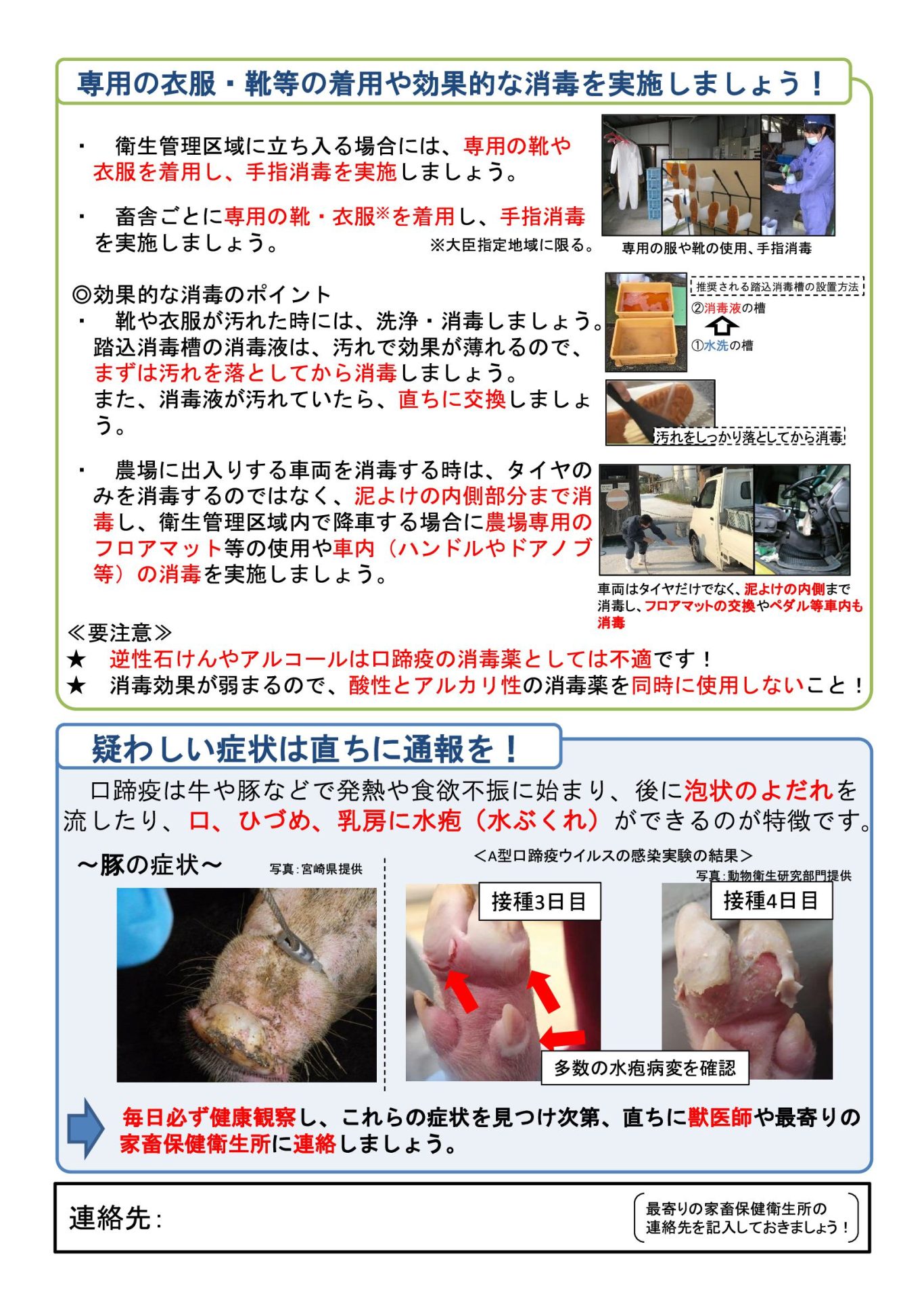 家畜の所有者は、 口蹄疫、 アフリカ豚熱等の特定症状についてよく習熟するとともに、 飼養家畜の健康観察を毎日入念に行い、 特定症状の疑いがある家畜を発見したときは、夜間、早朝、土曜日、日曜日等管轄の家畜保健衛生所の閉庁時であっても速やかに通報すること。また、都道府県は、聞き取りの結果、特定疾病の発生が否定できない場合は、直ちに家畜防疫員を通報のあった農場に派遣するとともに、速やかに動物衛生課に通報すること。